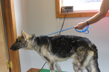 His foster mom tenderly gave him his first of many baths, to see what was under all the dried blood and filth. Then Dr. Kristen at Cypress Lake went to work treating his skin. She assured us he's going to be just fine -- his skin problems are very treatable. It's a bad case of demodex with secondary infections--painful and itchy, but not life-threatening. He's going to seeing her every week for treatment and medicated baths for at least a month, maybe longer.