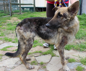 He has one of the worst cases of demodex we've ever seen. When we met him at the shelter, right after he was picked up, he was covered in blood and oozing sores. It looked like he had tried to scratch off of the side of his own face.