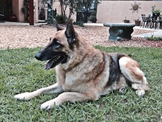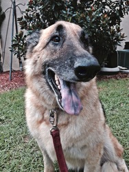 Sadie is a grand dame with a big presence. She weighs about 90 pounds, which puts her at the high end of the breed standard for a female. We estimate she's over 7 years old (probably 7-9). She tested negative for heartworm disease.