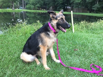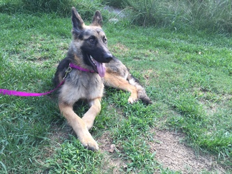 Blaze is a young, female German Shepherd Dog with a gorgeous, expressive face. We believe she is under a year old. She appears to have a plush-coat that someone cut short for summer, but we expect it eventually to grow back long and fluffy.