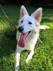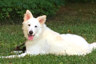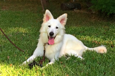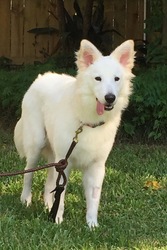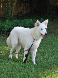 Dalton appears to be a plush-coated white German Shepherd. He's estimated to be just 10-12 months old -- barely an adolescent. He's around 45 pounds currently. He has soft, luxurious coat that invites snuggling! He enjoys being close to his people and being sweet.