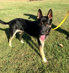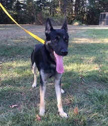 Jaeger appears to be a Belgian Malinois or possibly Malinois/German Shepherd cross. He is young (under a year old), and strikingly handsome.