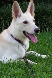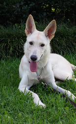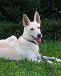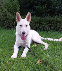 Sunshine is appears to be a white German Shepherd puppy around 6 months old. She earned her name honestly: she is friendly and playful with a sunny disposition. We think she'll likely be between 50-60 pounds when fully grown.