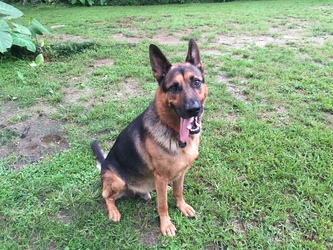Buckaroo (a/k/a "Buck") is a young, adult male German Shepherd Dog. We estimate that he's around 3 years old. He weights between 70-75 pounds. He has a big, broad head (a trait that's typical of some East German and Czech lines), and a very thick coat.