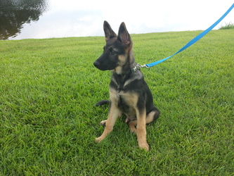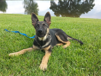 Drago is a male German Shepherd puppy, estimated to be about 16 weeks old. He's very large for his age and growing quickly -- we expect him eventually to grow to be 85 pounds or larger.