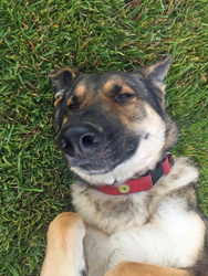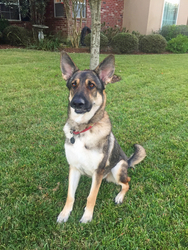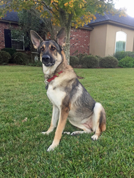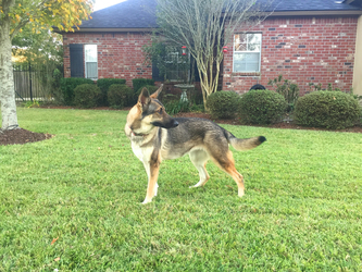 Scarlet is a young German Shepherd Dog. We estimate that she's only 1-2 years old (still an adolescent). She's an average-sized female, and she will probably weigh around 70 pounds when she's filled out.