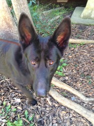 Schutz is affectionate and sweet with his people. He's a "soft" dog, which means he will melt with just a verbal correction. He would likely benefit from some positive training to build up his self-confidence. When he gets confused, he sometimes barks at new people or sounds that scare him--telling him "no" is enough to cause him to go down on his belly, as he tries to say "Oops! Sorry!"