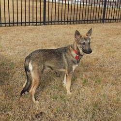 Wiley is a youngster under a year old. He was reportedly born in June 2016. We think he's a Belgian Malinois (possibly purebred, or crossed with German Shepherd Dog). His body structure is typical of a Malinois: smaller and leaner than a GSD, very agile, and athletic.