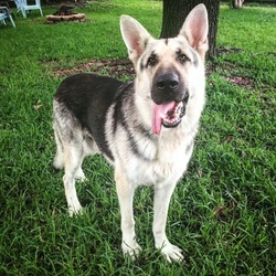 He's a German Shepherd Dog crossed with a....dinosaur. Or a small pony. Or perhaps a Great Dane. He's the biggest dog we've ever seen come through our rescue! He's very handsome. However, he's also a big, dopey klutz -- right in the middle of the "clumsy adolescent stage" where he has no sense of where is body is or how strong he is.