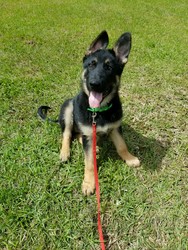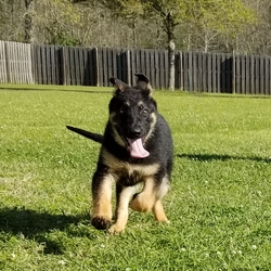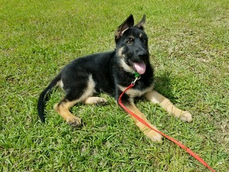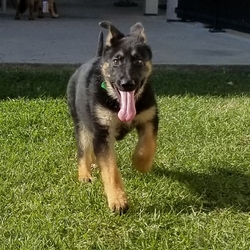 Remi is a gorgeous German Shepherd puppy. We estimate she's 15-16 weeks old. From her bone structure, it looks like she is going to be BIG for a female -- over 75 pounds would be our guess. She has a gorgeous gait for a puppy.
