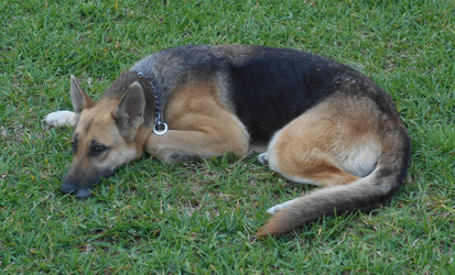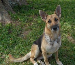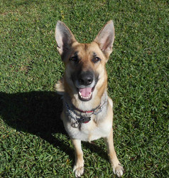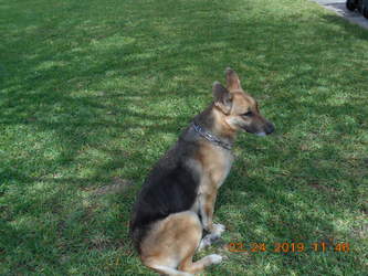 Grace is a lovely female German Shepherd Dog. We don't know her age, but she's an adult which means she's likely 3-5 years old, and a healthy weight at right around 65 pounds.