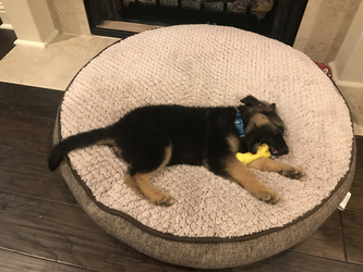 Before you apply to adopt a puppy, please consider: normal GSD puppies are ALL little stinkers. It's just how they roll. They put sharp, little teeth on everything (and humans are favorite chew toys, because they squeak the loudest). They sometimes tear stuff up because it's fun (the more expensive the stuff, the better it tastes). They can't hold their little bladders, so you might have to get up in the middle of the night and may not have a good night's sleep for months. You might come home from work to find a soiled crate, and when you've had a long, hard day, the puppy will still need attention. They're rambunctious and might not mellow out for at least a couple of years. We generally don't place young, mouthy puppies to be "starter dogs," or in homes with young kids.