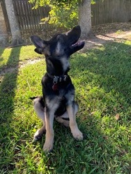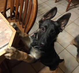 If you already know how time-intensive (and exhausting) GSD puppies can be, and you're up for having your shoes and landscaping destroyed, your hands and toes chewed on, and holes put in your favorite pants, cleaning up potty accidents, and you have the patience, know-how, and time to raise, socialize, and train this breed (and have great references), you're our kind of puppy adopter! We can't guarantee he's purebred, but he sure does look like it to us. However, what you see is what you get with puppies--there are no pedigrees or promises about what they'll look like when they grow up. He was picked up stray by animal control and pulled out of a parish animal shelter, so we don't know anything about his prior life before rescue. We've promised that he'll never be left behind again, so adopting is a life-long commitment for 12+ years.